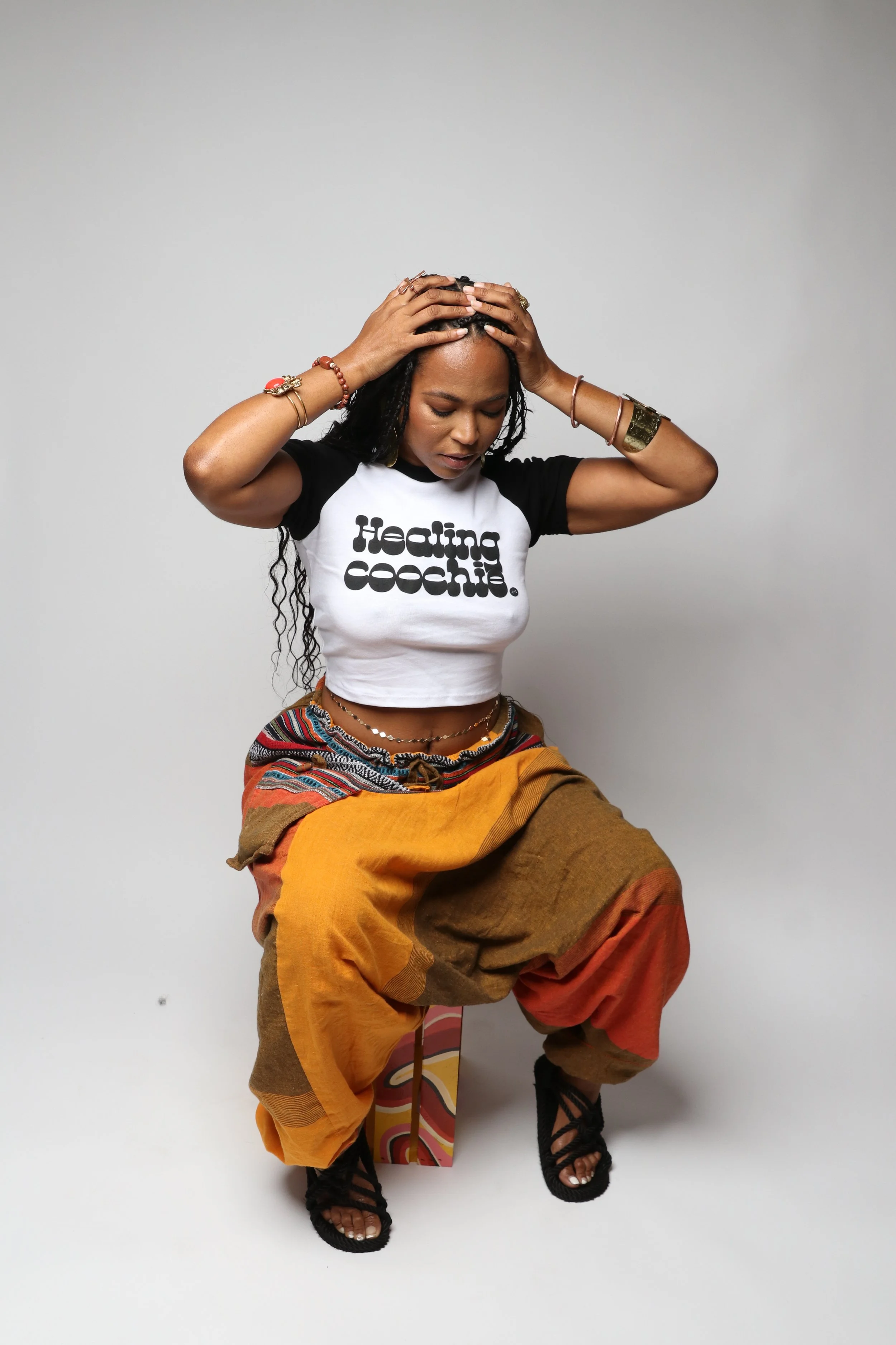 Grass Green and Baby Yellow with Brown Print Healing Coochie Tee.